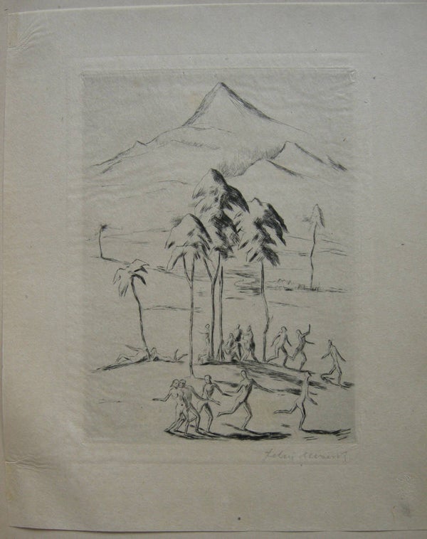 Felix Meseck Ets (droge naald) 'Landschap met dansende mensen' ~1920 Gesigneerd